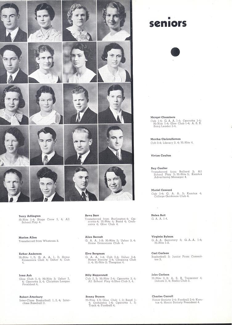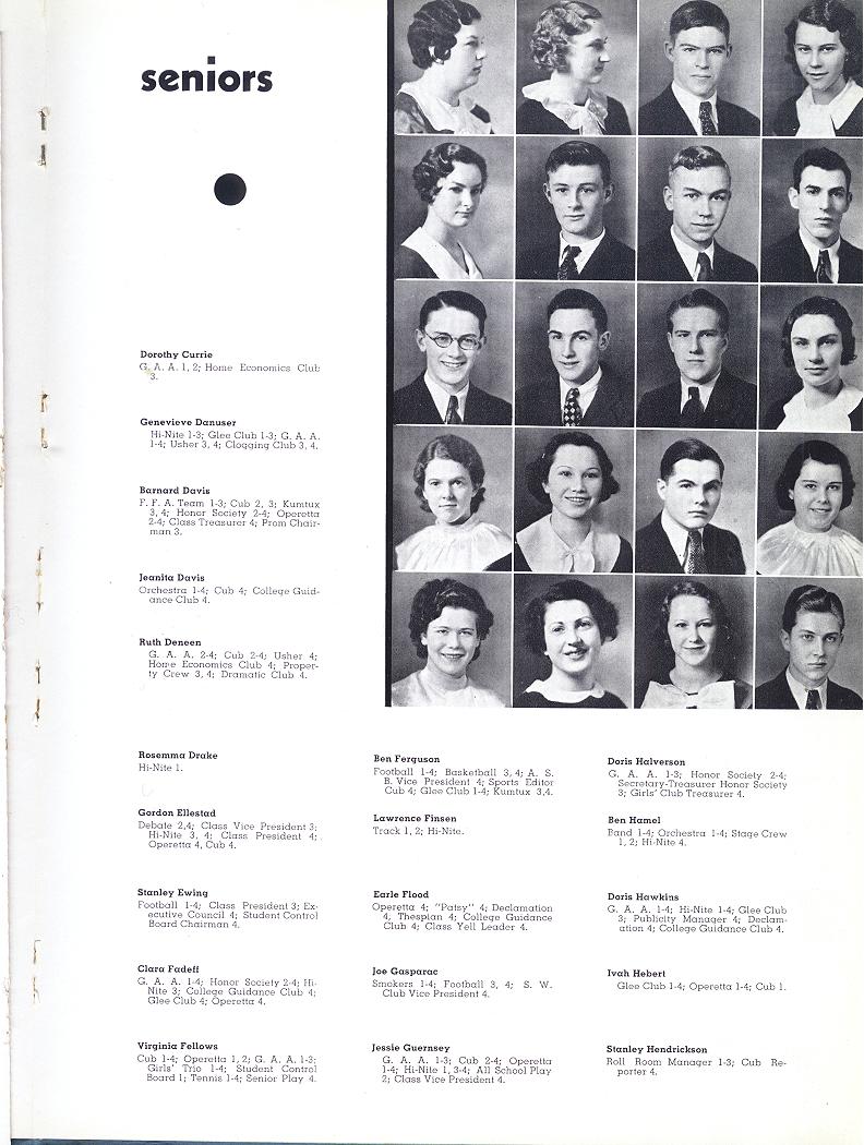 Terry Adlington, Marion Allen, Esther Anderson, Irma Ash, Robert Atterbury, Reva Barr, Alice Becraft, Elva Bergman, Billy Biggerstaff, Benny Bryson, Margot Chambers, Martha Christofferson, Vivion Coultras, Ray Coulter, Muriel Coward, Helen Butt, Virginia Byham, Carlson, John Carlson, Charles Carroll, Dorothy Currie, Genevieve Danuser, Barnard Davis, Jeanita Davis, Ruth Deneen, Rosemma Drake, Gordon Ellestad, Stanley Ewing, Clara Fadeff, Virginia Fellows, Ben Ferguson, Lawrence Finsen, Earle Flood, Joe Gasparac, Jessie Guernsey, Doris Halverson, Ben Hamel, Doris Hawkins, Ivah Hebert, Stanley Hendrickson