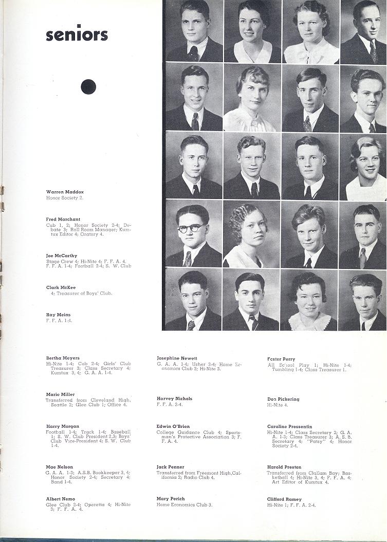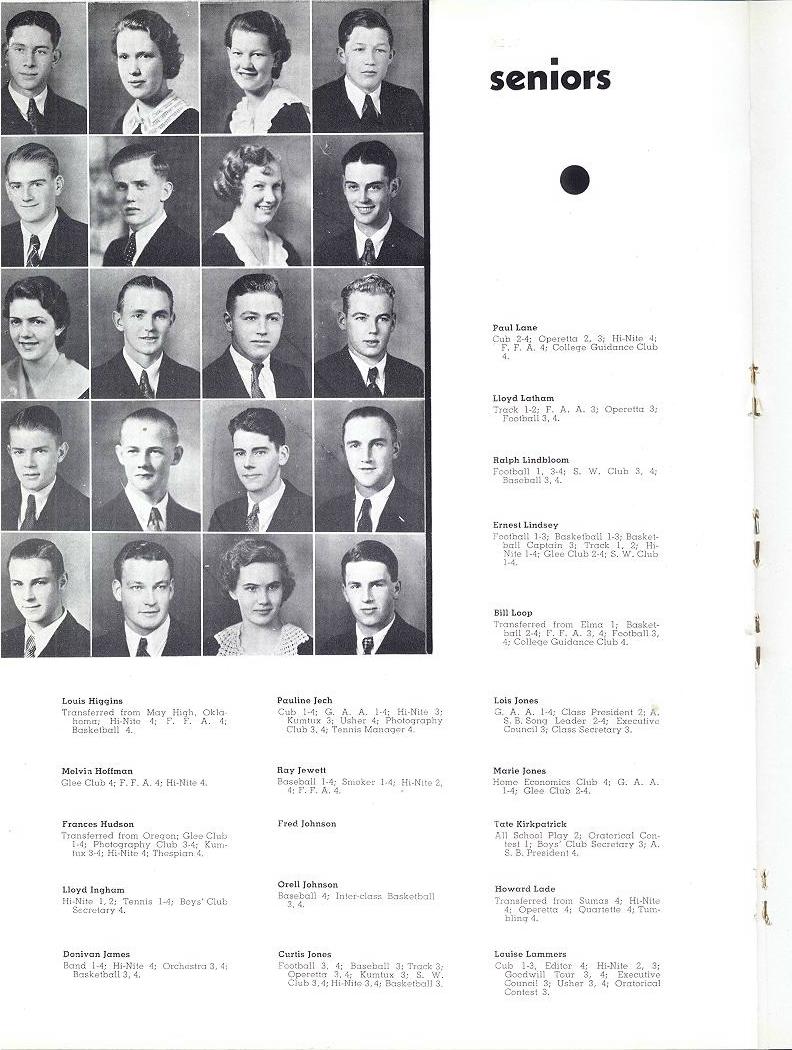Louis Higgins, Melvin Hoffman, Frances Hudson, Lloyd Ingham, Donivan James, Pauline Jech, Ray Jewett, Fred Johnson, Orell Johnson, Curtis Jones, Paul Lane, Lloyd Latham, Ralph Lindbloom, Ernest Lindsey, Bill Loop, Lois Jones, Marie Jones, Tate Kirkpatrick, Howard Lade, Louise Lammers, Warren Maddox, Fred Marchant, Joe McCarthy, Clark McKee, Ray Meins, Bertha Meyers, Marie Miller, Harry Morgan, Mae Nelson, Albert Nemo, Josephine Newett, Harvey Nichols, Edwin O'Brien, Jack Penner, Mary Perich, Foster Perry, Don Pickering, Caroline Pressentin, Harold Preston, Clifford Ramey